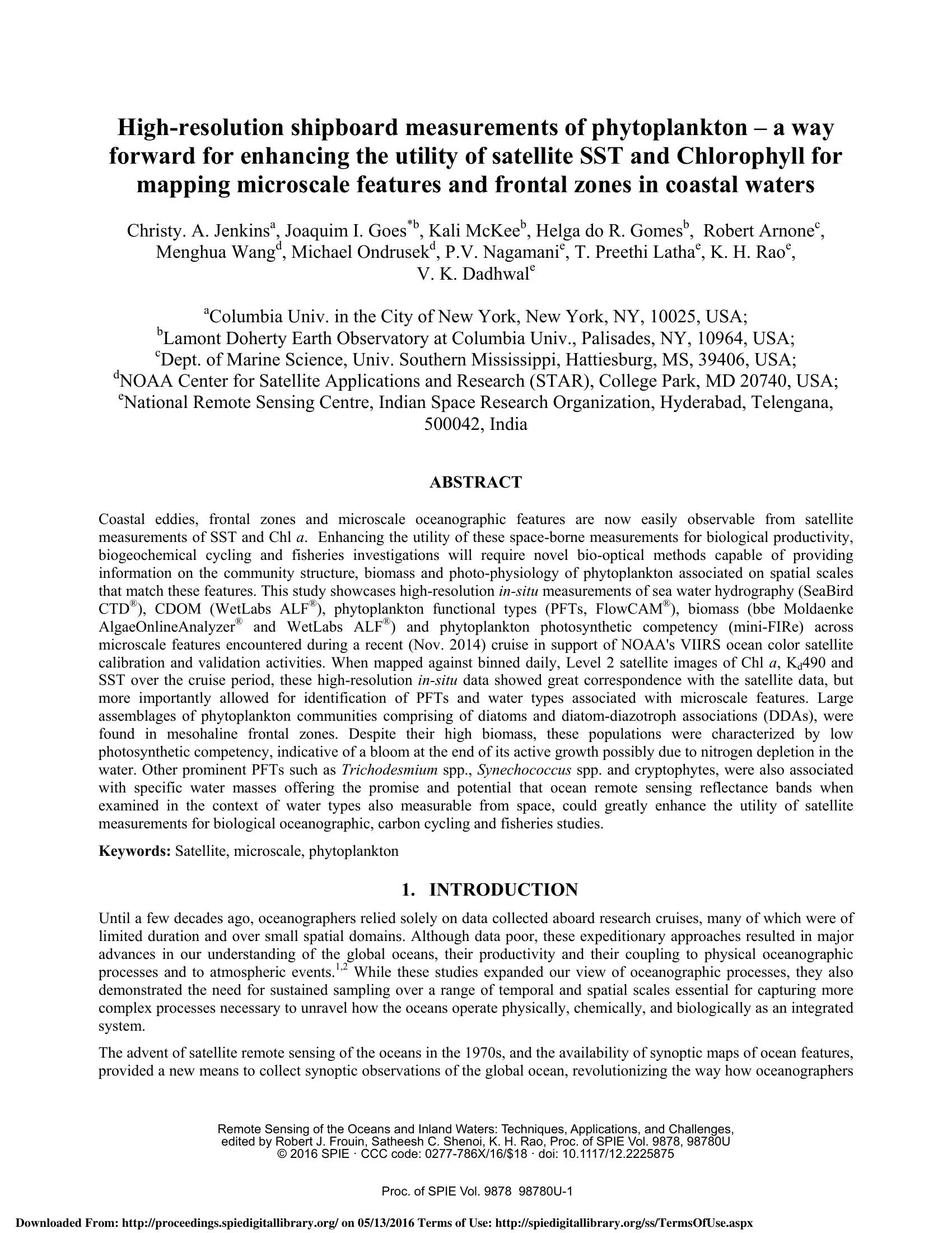 Remote Sensing of Environment | PDFHigh-resolution shipboard measurements of phytoplankton – a way forward for enhancing the utility of satellite SST and Chlorophyll for mapping microscale features and frontal zones in coastal waters (2016)