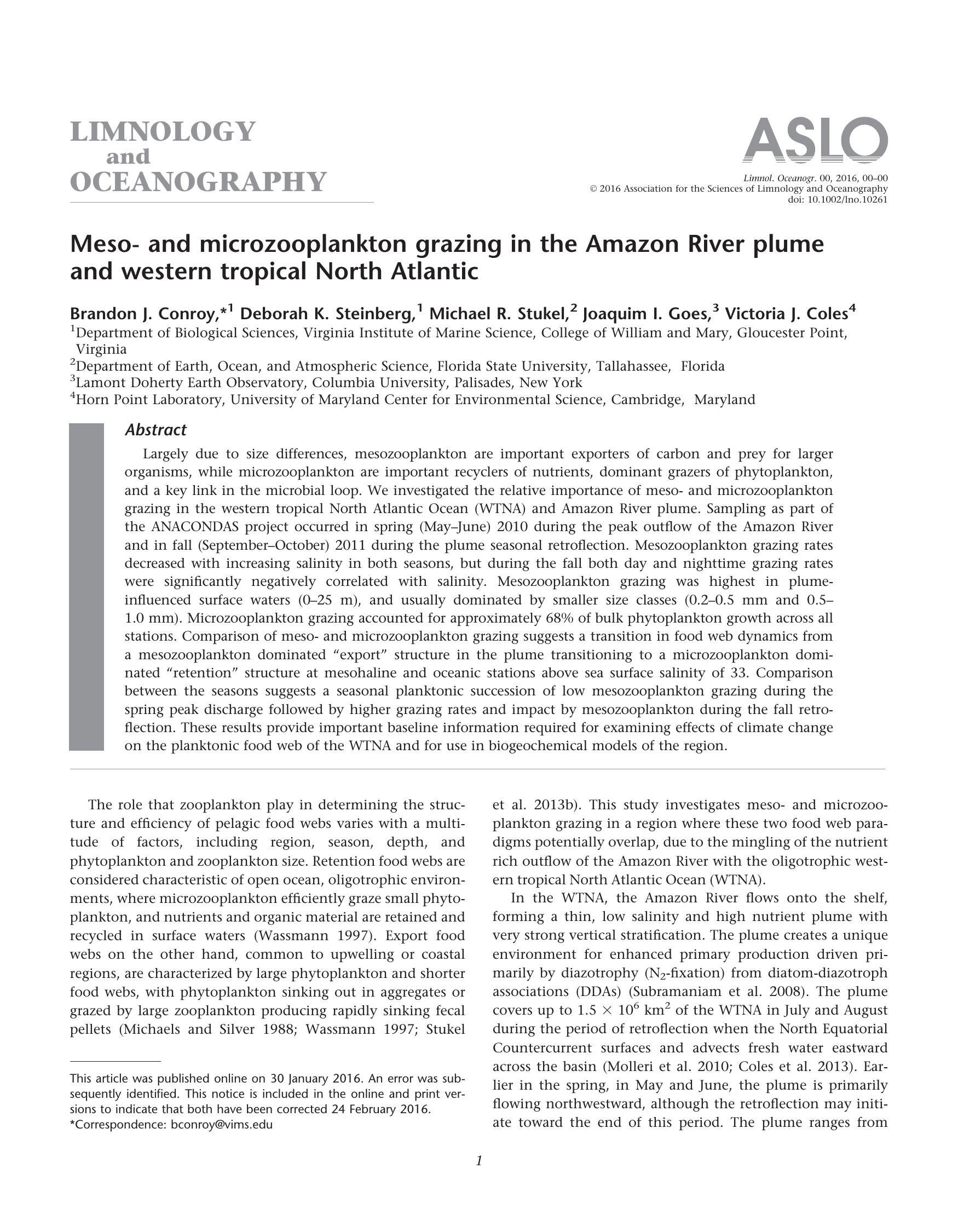 Journal of Plankton Research | PDFMeso- and microzooplankton grazing in the Amazon River plume and western tropical North Atlantic (2016)