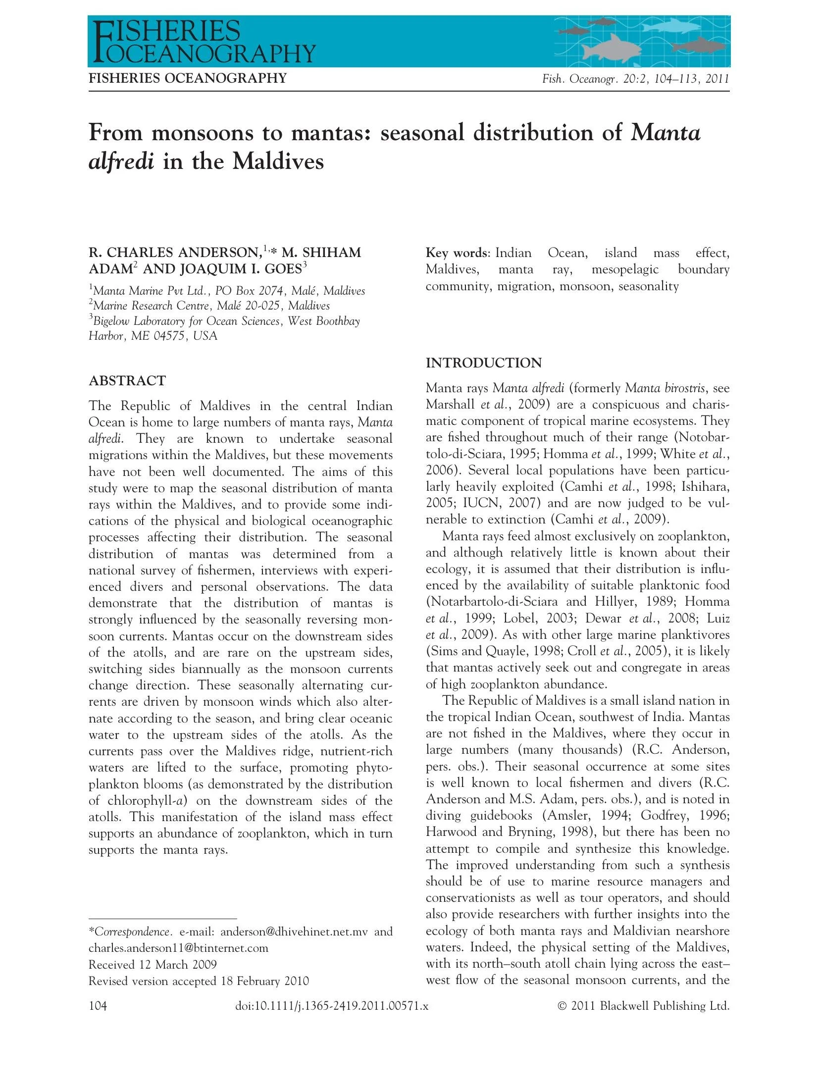 Journal of Water Resource and Protection | PDFFrom monsoons to mantas: seasonal distribution of Manta alfredi in the Maldives (2011)