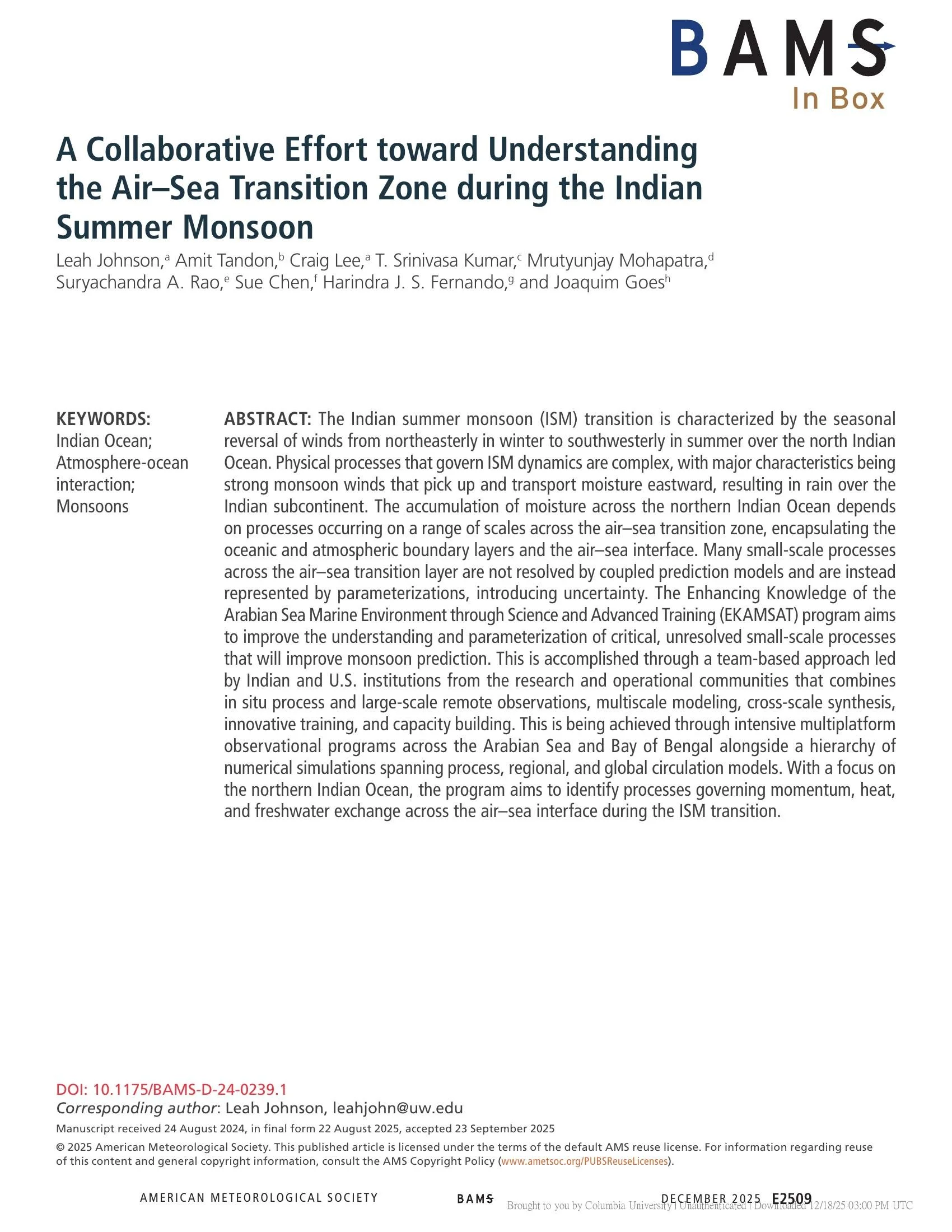 Deep-Sea Research Part II | PDFA Collaborative Effort toward Understanding the Air–Sea Transition Zone during the Indian Summer Monsoon (2025)